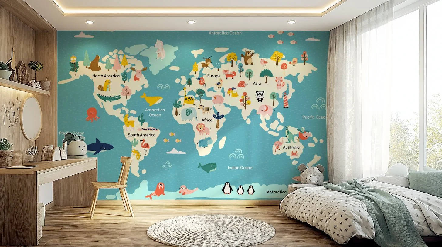 The animal adventure world map wall mural offers a practical way to spark curiosity about geography and nature in any residential setting. This high-quality kids wallpaper functions as a functional backdrop for a child's bedroom or a dedicated study space, blending soft aesthetics with informative illustrations of global wildlife. Beyond children's areas, the subtle color palette and clean lines make it a suitable choice for a creative home office or a unique feature wall in a living room. The design uses clear icons to represent different species across continents, providing a visual learning tool that remains visually organized. This animal adventure world map wall mural is printed on durable materials, ensuring a smooth finish for long-term use in high-traffic areas. It serves as an engaging focal point that complements modern furniture and neutral decor styles while encouraging a sense of exploration.
