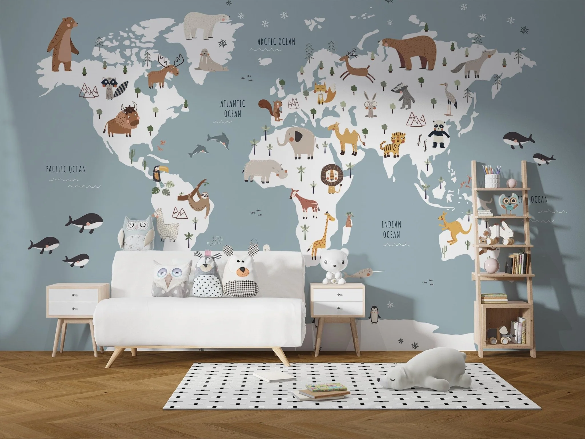 Revamp your space into a world adventure with our animals blue world map wall murals. With beautifully illustrated charm, this mural features a colorful world map and other cute animal icons. While educational and decorative, this soothing blue is perfect for kids' bedrooms, playrooms, and learning centers. Made from high-quality peelable materials, the decoration is easy to put on and remove, saving a lot of hassle in the decoration process. This captivating wall mural will inspire a sense of wonder and appreciation for nature and make your walls look interesting.