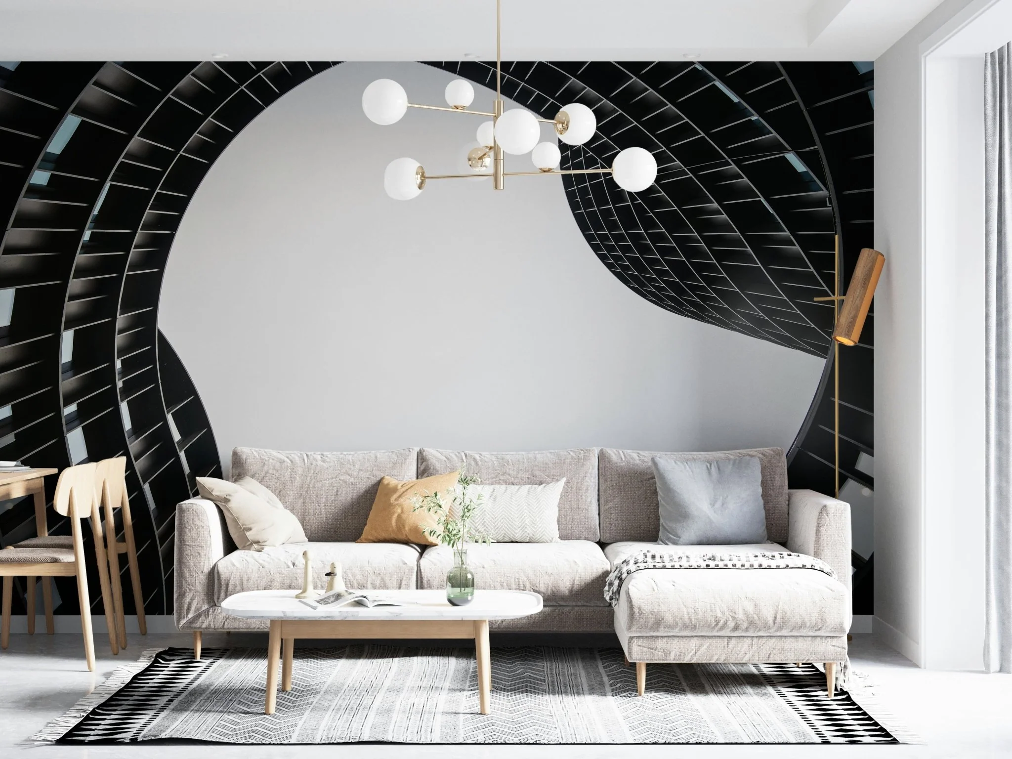 Architectural geometry wall mural brings structured rhythm to modern interiors with sweeping black arcs and a soft gray field that keeps the room balanced. Use an architectural wall mural as a feature wall behind a sofa in the living room, or place it behind a headboard to add depth in a bedroom without busy patterning. In an office, the graphic layout supports a clean backdrop for video calls and work.