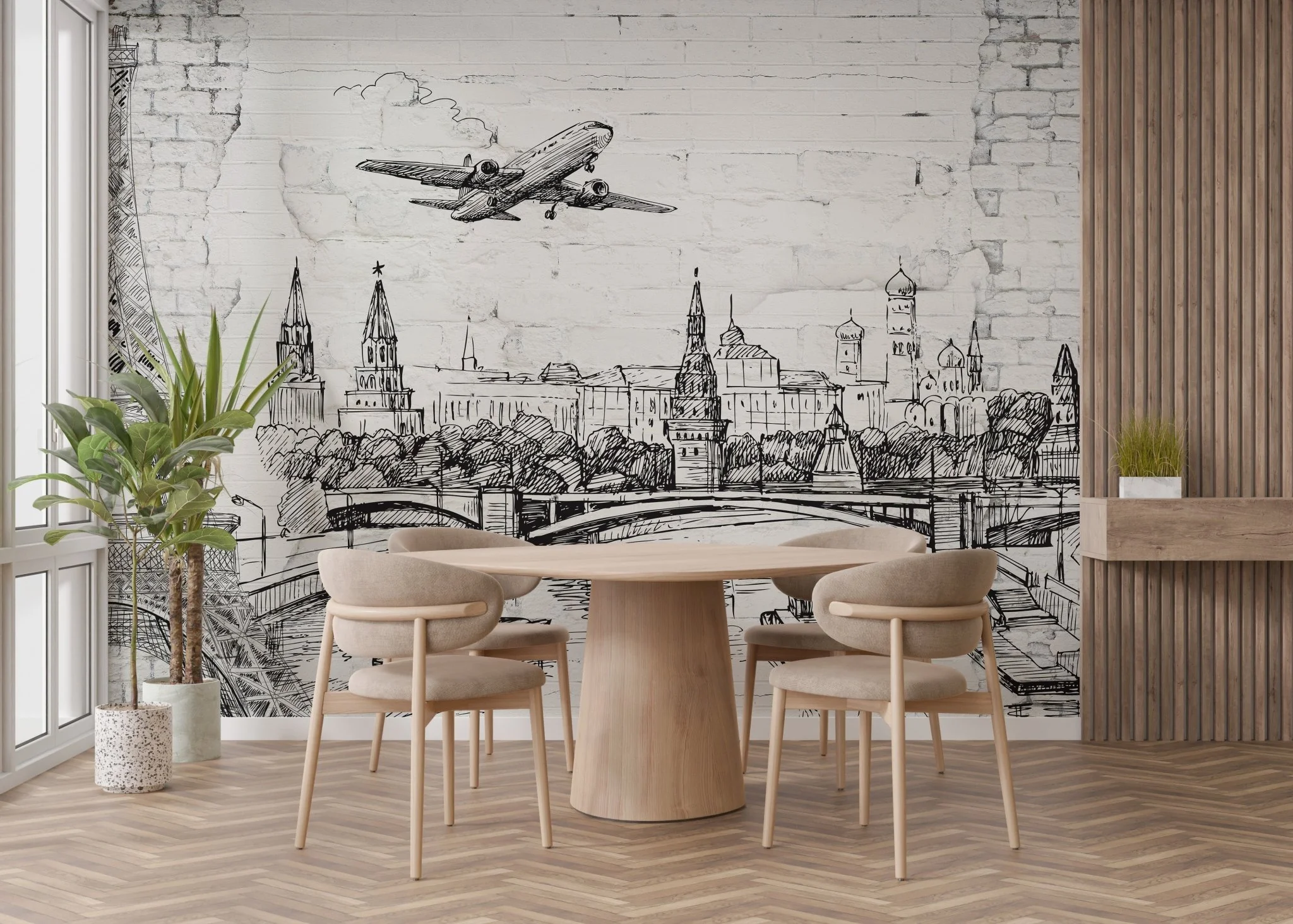 Architectural Wonders on Brick Wall Murals combine timeless blends of art sketches and the charm of cities. Architectural icons such as bridges, towers, and cityscapes drawn with hands blend with textured brick backdrops to offer an excellent mural style for use in the house or an office, providing a wonderful blend of sophistication and contemporary style using detailed illustrations. It can be paired with brick wallpaper or other textured designs to create a complementary and cohesive interior theme. This mural will make it possible to add a unique visual element to any space, ranging from a living room or study to a hallway. Architectural Marvels on Brick Wall Murals blend art and design effortlessly and fit seamlessly into all decor styles, creating a timeless design statement.