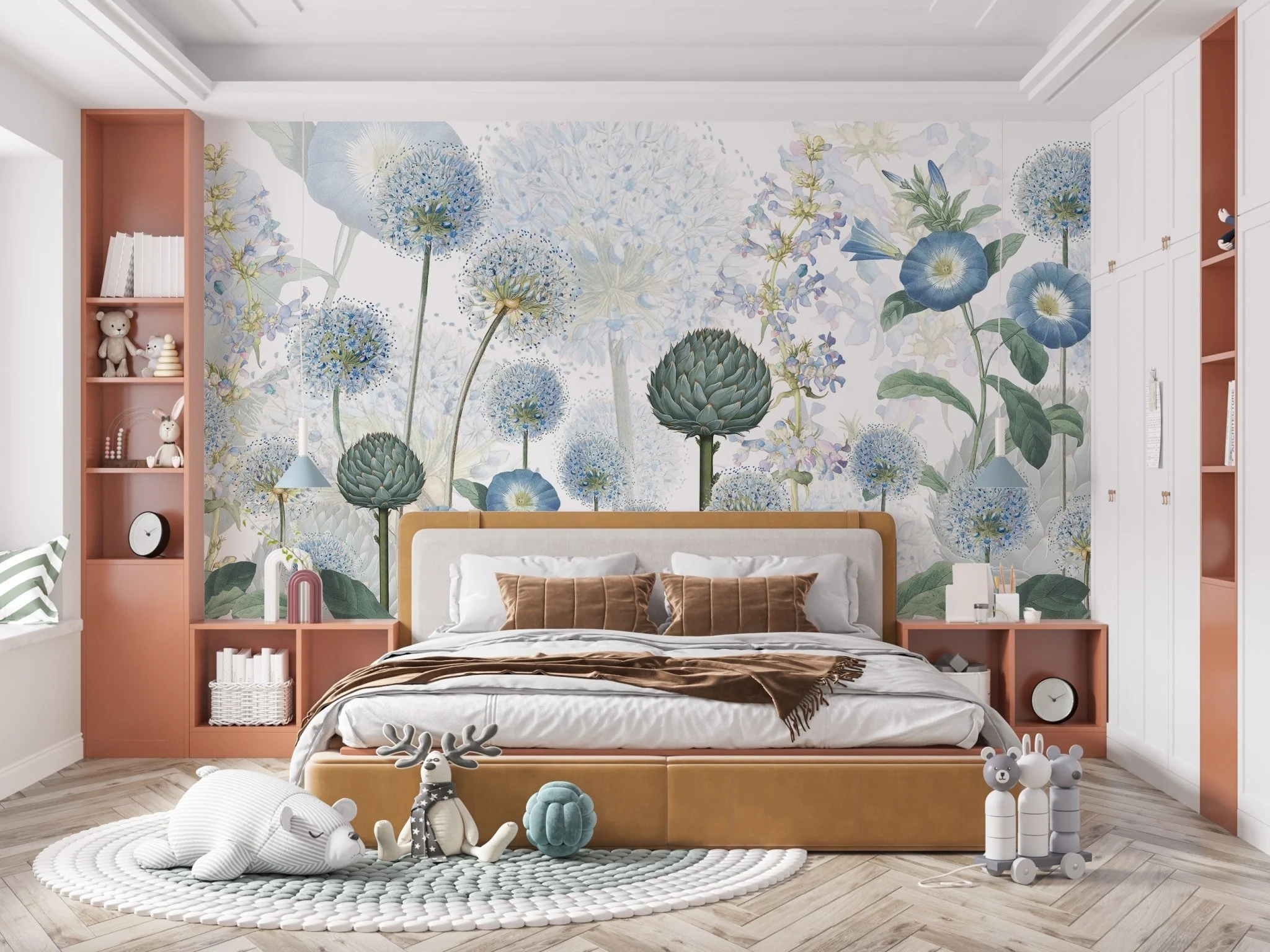 Immerse yourself in the natural artistry of the azure flora wall mural. This piece is a stunning testament to the timeless beauty of floral wallpaper. It captures the essence of a wild meadow, where whispers of blue blend with flora in a dance of quiet harmony. Perfect for accenting a room with a touch of nature's own design, it offers a refreshing visual escape. Adorning your wall with this mural infuses your day with the subtle poetry of a blooming garden, providing a backdrop that speaks of nature's effortless grace and the enduring charm of floral elegance.