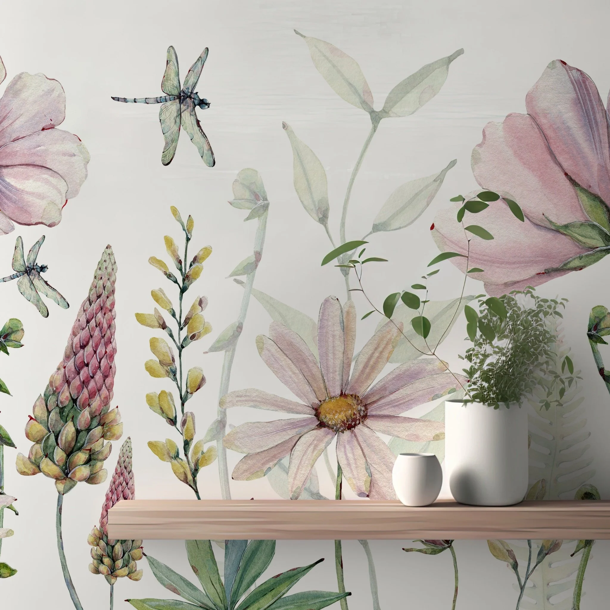 Add a soft botanical look to your interior with enchanted bloom watercolor array mural. This floral design features hand-painted blooms, delicate leaves, and subtle dragonfly details in a light pastel color palette. The watercolor effect gives the mural a calm and airy appearance that works well with modern wall decor and relaxed styling. It fits beautifully in a living room, bedroom, office or as a feature wall where gentle pattern and natural detail are needed. The mix of blush pink petals, soft greenery, and open spacing helps the wall feel bright without looking busy. Printed on quality material, this mural offers a clean finish and an elegant surface look. Enchanted bloom watercolor array mural is a practical choice for apartments and homes that need floral wall decor with a fresh, artistic feel.