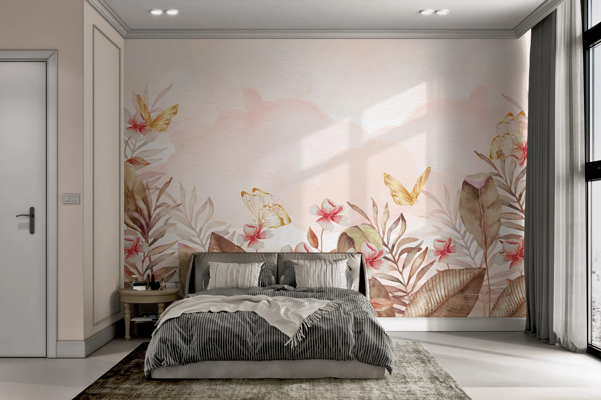 Soft pastels and gold accents create a soothing touch with this gold butterfly watercolor floral wallpaper. Delicate butterflies with shimmering wings blend with botanical leaf design and earth-tone floral art, bringing warmth to any setting. The pastel pink background complements the intricate floral details, offering a refined and calming look. Perfect for bedrooms, living areas, or creative spaces, this design enhances walls with a graceful appeal. The nature-inspired wall art blends effortlessly with modern and classic interiors. Let the beauty of delicate floral patterns and elegant gold butterflies refresh your surroundings with a timeless style.