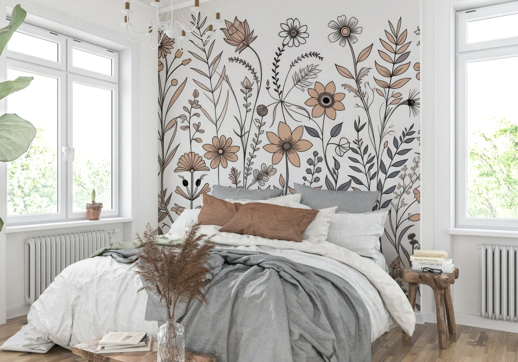 In a living room, pair it with textured throws and simple framed art. In a bedroom, keep bedding solid so the sketch details read clearly. For an office, the linework adds interest during video calls while staying understated. This floral wallpaper style also fits a hallway with a slim console and warm lighting. Choose neutral flora sketch wall mural when you want a balanced backdrop that coordinates with modern, rustic, or Scandinavian decor.