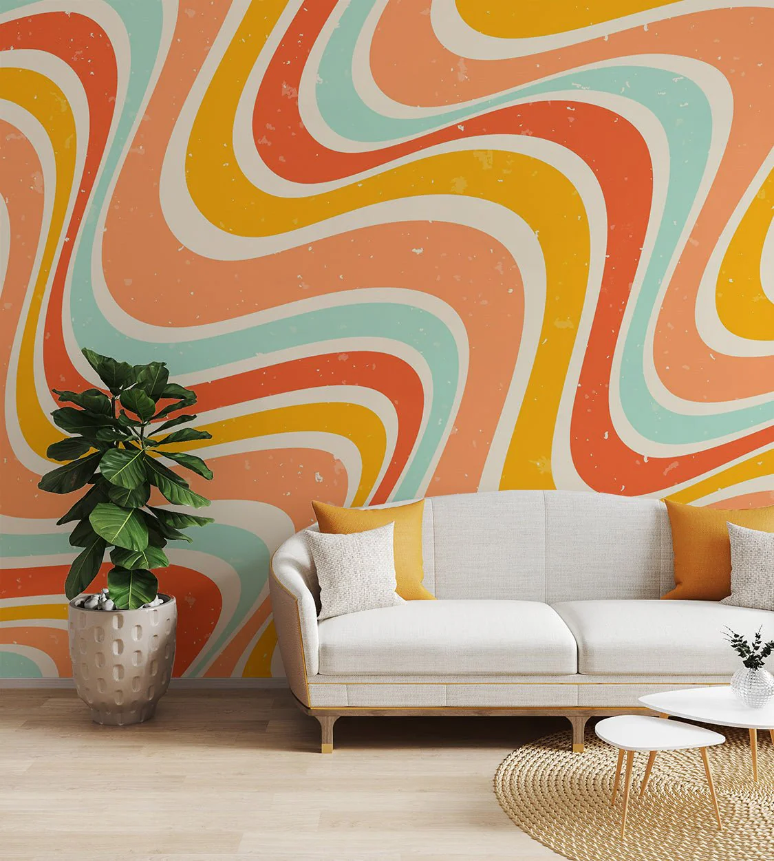 Bold curves and vibrant colors define this retro wavy pattern wallpaper. The 70s psychedelic mural blends orange, yellow, peach, and aqua tones, creating a groovy and nostalgic feel. The vintage, groovy aesthetic wallpaper adds energy to living rooms, creative spaces, or statement walls. The colorful abstract wave design wallpaper features a seamless, flowing pattern inspired by mid-century style. The funky 1970s-inspired wallpaper pairs well with modern and retro interiors, offering a bold and playful touch. The distressed vintage-style wall covering completes the look with a textured finish, making it a standout piece for unique interiors.